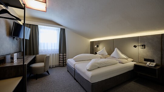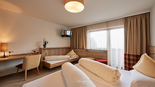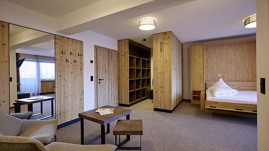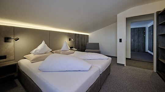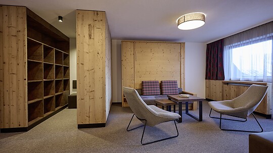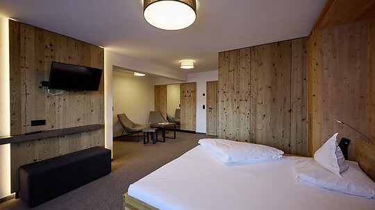 Approx. 50 m², spacious, comfortable double room with separate sleeping and living area in a cozy Alpine design.