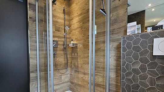 - modern bathroom with shower, toilet, hairdryer